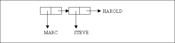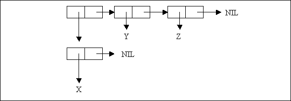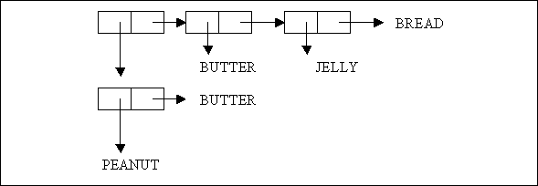third dot looks like a list with BUTTER as its CAR. Note that this list has two pointers to the same symbol, BUTTER.